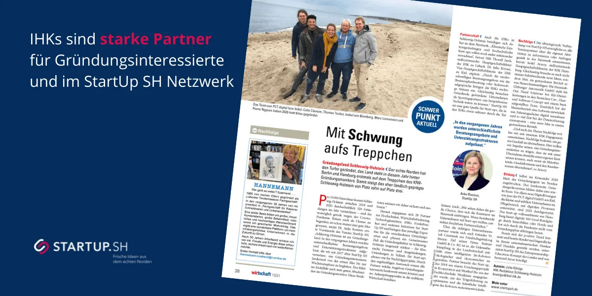 Gründen ist vielseitig. Daher engagieren sich in unserem Netzwerk ganz verschiedene Institutionen für ein starkes Gründungsland Schleswig-Holstein. In der aktuellen Ausgabe von „Wirtschaft zwischen Nord- und Ostsee“ zeigen die IHKs in Schleswig-Holstein mit welchen Angeboten sie Gründungen im Norden unterstützen. Die Bandbreite reicht von klassischer Gründungsberatung über Begleitung bei der Suche nach Nachfolger:innen bis zu KMU meets Start-up.